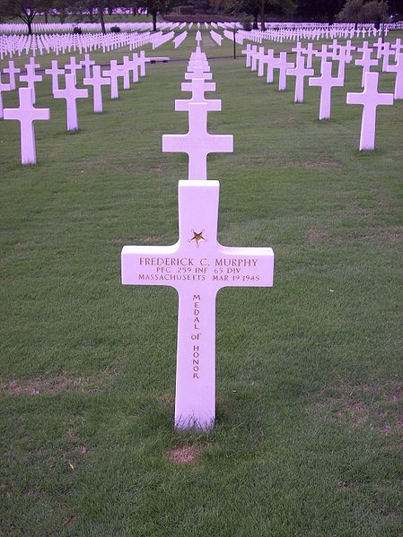 shoulder soon after his comrades had jumped off in a dawn attack 18 March 1945, against the Siegfried Line at Saarlautern, Germany. He refused to withdraw for treatment and continued forward, administering first aid under heavy machinegun, mortar, and artillery fire. When the company ran into a thickly sown antipersonnel minefield and began to suffer more and more casualties, he continued to disregard his own wound and unhesitatingly braved the danger of exploding mines, moving about through heavy fire and helping the injured until he stepped on a mine which severed one of his feet. In spite of his grievous wounds, he struggled on with his work, refusing to be evacuated and crawling from man to man administering to them while in great pain and bleeding profusely. He was killed by the blast of another mine which he had dragged himself across in an effort to reach still another casualty. With indomitable courage, and unquenchable spirit of self-sacrifice and supreme devotion to duty which made it possible for him to continue performing his tasks while barely able to move, Pfc. Murphy saved many of his fellow soldiers at the cost of his own life.