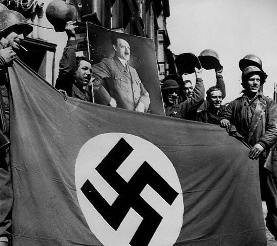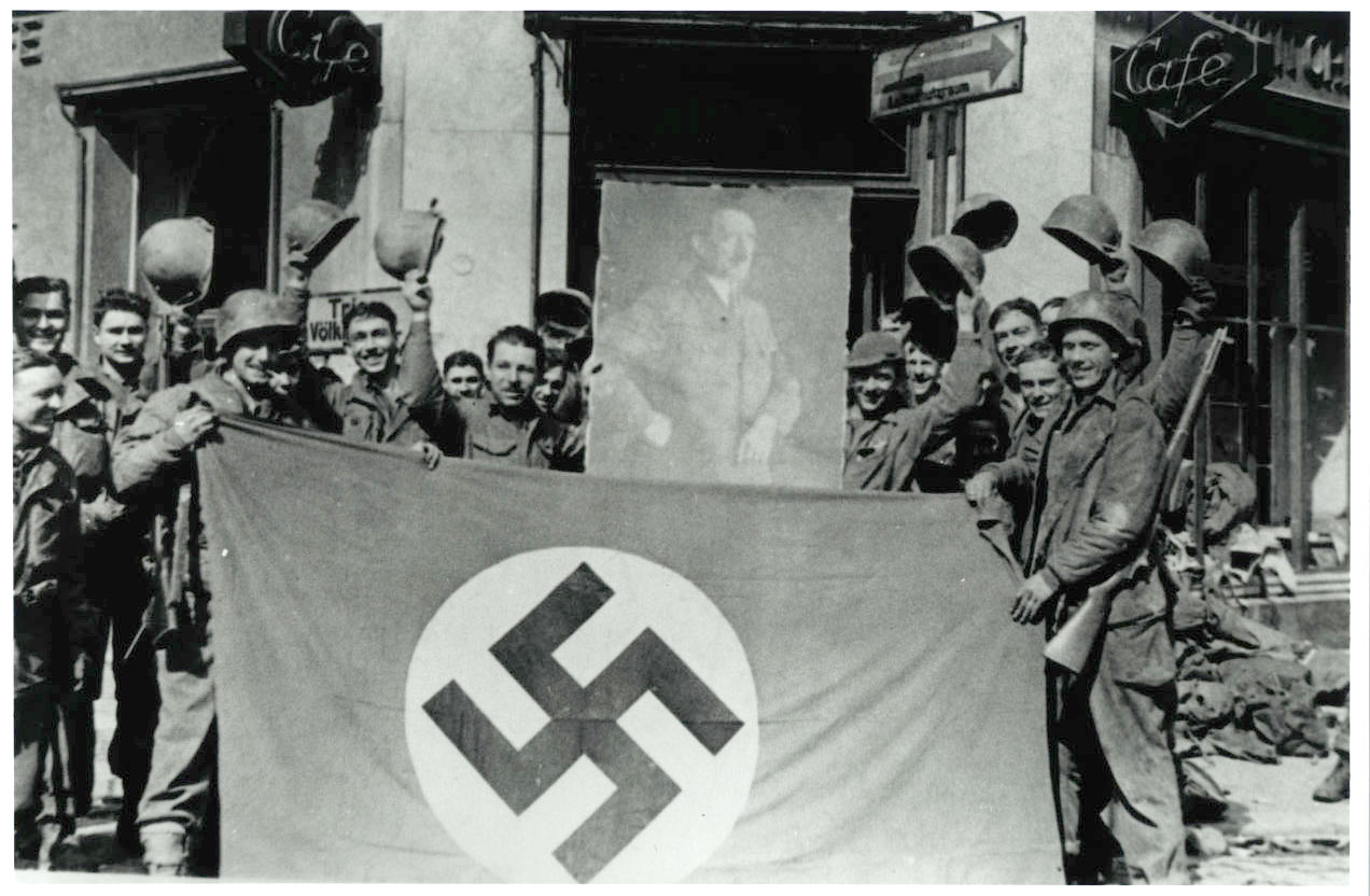 Capture of Saarbrucken. GIs of 70th Div seen with Nazi flag and portrait of Hitler. 22 Mar 1945